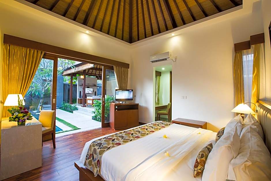 This spacious two-bedroom villa comes with a private outdoor swimming pool and surrounded by lush tropical gardens. It also has a separate living area, dining area, and a kitchenette. Each bedroom is air-conditioned and fitted with a wardrobe and an private bathroom featuring shower facility.