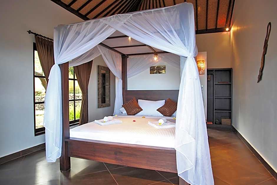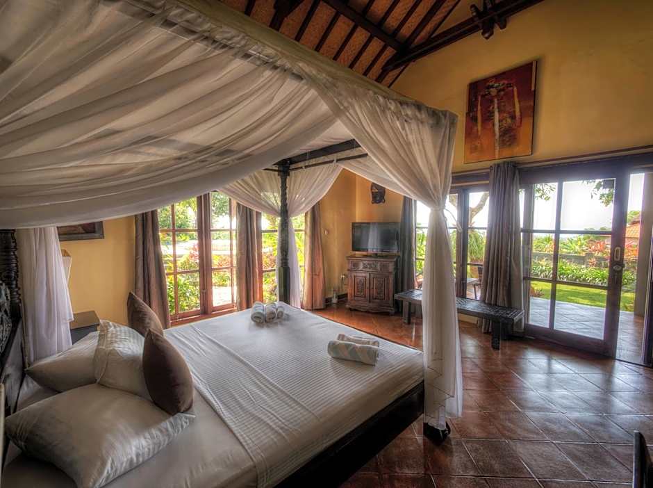 Accommodations span from the intimate Lumbung to expansive villas, including Deluxe rooms, Superior Villas, and villa configurations with private pools. Some options can host large groups—up to 20 adults and 13 children in certain villas—offering plenty of space for families or friends. Private entrances, kitchenettes, patios, and balconies are available, with many units providing sea, garden, or mountain views to enhance the tropical mood.