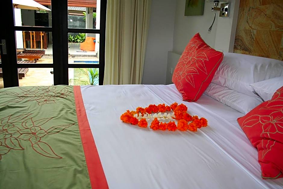 This elegant two-bedroom villa features a private outdoor swimming pool, a separate living area, dining area, and a large well-equipped kitchen. Each bedroom is air-conditioned and the private bathrooms have shower facility.