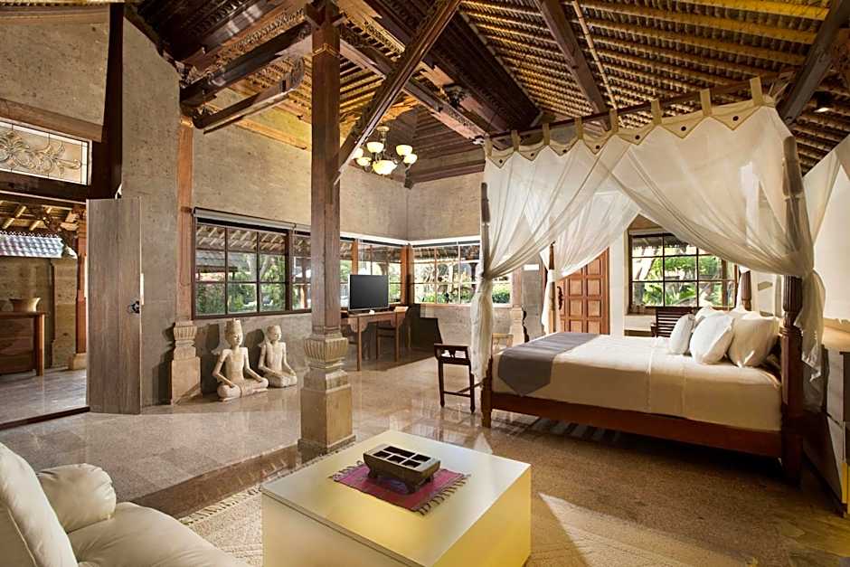 Dating more than a century old, this Balinese community hall of Bualu village, Nusa Dua was rescued from total demolition and transformed into a twin queen bedroom villa. Built in the style of saka roras, literally meaning ‘twelve pillars’, all the original pillars are complementary in keeping the entire building up. An ornate garuda statue keeps watch over the two queen beds, for a peaceful slumber. This twin room has a balcony, bathrobe and sofa.