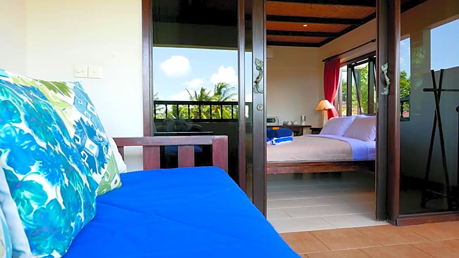 This comfortable air-conditioned garden suite features a large balcony with seating area, day bed, and tropical garden views.