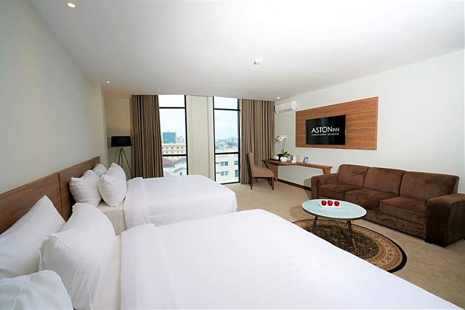 At ASTON Inn Pandanaran, there are Deluxe Double or Twin Rooms, Suites, and Executive Rooms available. Smoking is not allowed in any of these rooms. The Deluxe Double or Twin Rooms have a size of 237 sqft and can accommodate 2 adults and 2 children, with 2 twin beds and 1 queen bed. The Suites have a size of 474 sqft and accommodate the same number of guests, with a king-size bed. The Executive Rooms have a size of 355 sqft and also accommodate 2 adults and 2 children, with a queen-size bed.