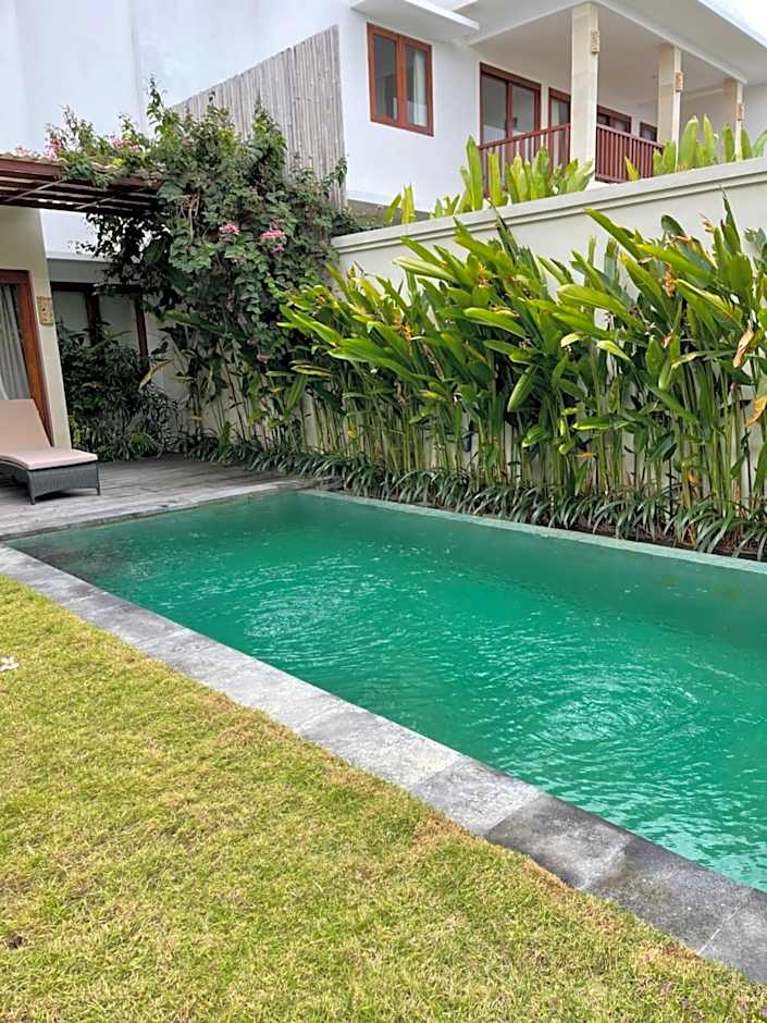 The 2-story villa features a private pool, kitchen and private bathroom with bath tub and shower. Bedrooms are located upstairs and have a balcony overlooking the swimming pool.