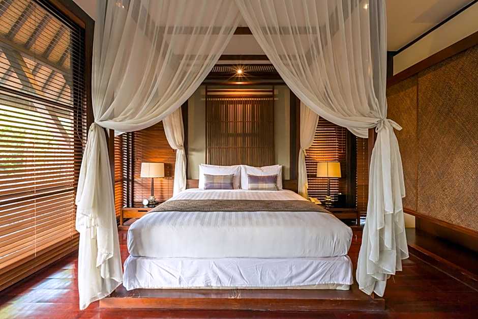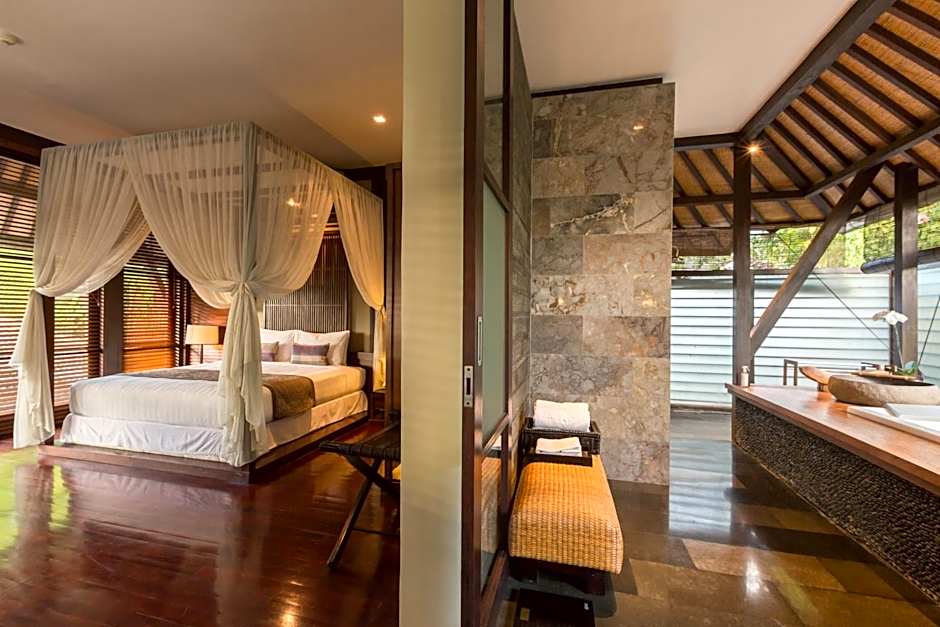 This villa features a private pool, an open-air living and dining area, and a spa bath in the bathroom.