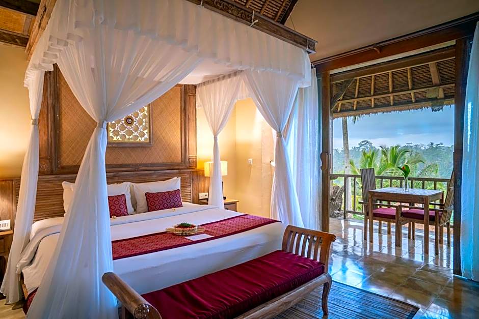 This spacious suite features a private balcony overlooking the garden, pool, valley and rice fields.