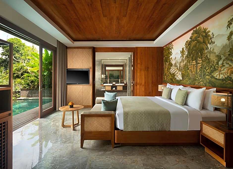 Accommodation options range from king rooms to generous villas and suites, including a Villa with a private pool and multiple bedrooms, a Villa with a private pool and other configurations, and various suites like the Suweta Suite and Adiwana Suite. Some units feature a kitchenette, a balcony, or a terrace, and a private entrance adds a touch of privacy. Balconies offer river or garden views, framing a tranquil backdrop after days of exploring Ubud. Comfort essentials such as free toiletries, a bidet, a bathtub, and a 24-hour front desk support a comfortable stay.