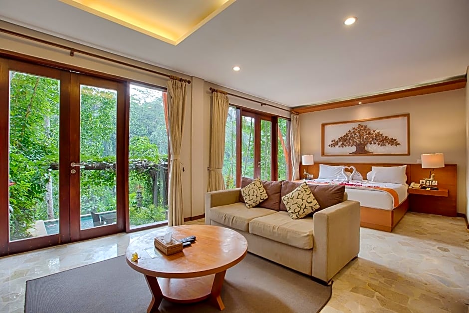 The hotel offers various suite rooms including Suite Room with Private Pool, Suite with Garden View, Suite Room with Jungle View, and Executive Suite. These suites have a room size of 1076 sqft and can accommodate 2 adults and 1 child. Smoking is not allowed in any of these rooms and they feature different bed sizes such as King size, Queen size, and Sofa Bed.