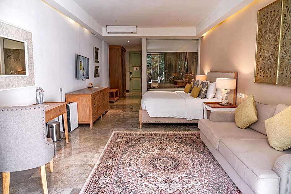 This stylish one-bedroom villa features traditional design elements and comes with beautiful wooden furniture, decorative arts, and calming color combination. It also has a living area, air-conditioned bedroom, wardrobe, and an private bathroom featuring shower facility. There is also a dedicated space where guests can enjoy the amazing views of the surrounding area.
