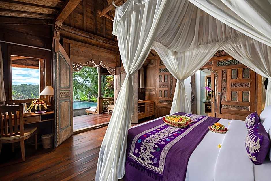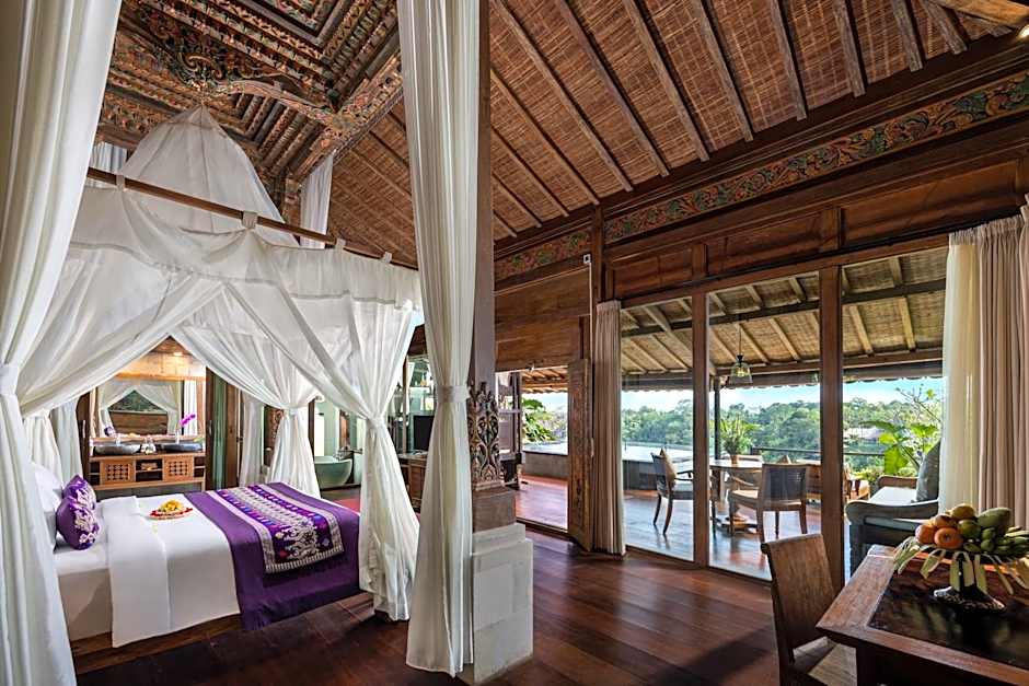 The hotel offers suites and villas. The suite options include the Pramana Suite and Ayung Valley Suite, both with a king-size bed and a room size of 592 sqft and 797 sqft, respectively. The villa options include the Wooden One-Bedroom Villa, Villa with Private Pool, One-Bedroom Pool Villa, Royal Ayung One-Bedroom Pool Villa, and Standard Villa. These villas feature a king-size or queen-size bed, a room size ranging from 1184 sqft to 1399 sqft, and all have a private pool except for the Standard Villa. None of the rooms allow smoking.