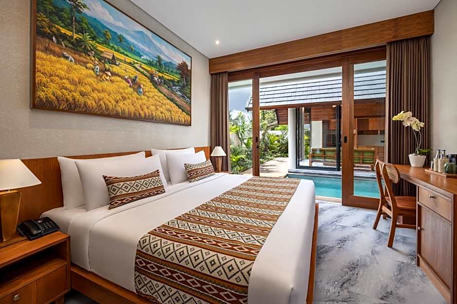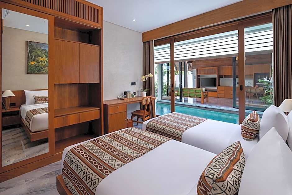Two refreshing options invite easy dives: a private pool and a free, all-season outdoor infinity pool. Open to guests of all ages, these waterside nooks pair with garden views and a sun-washed terrace for a carefree Bali vibe.