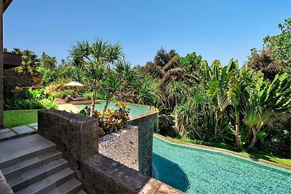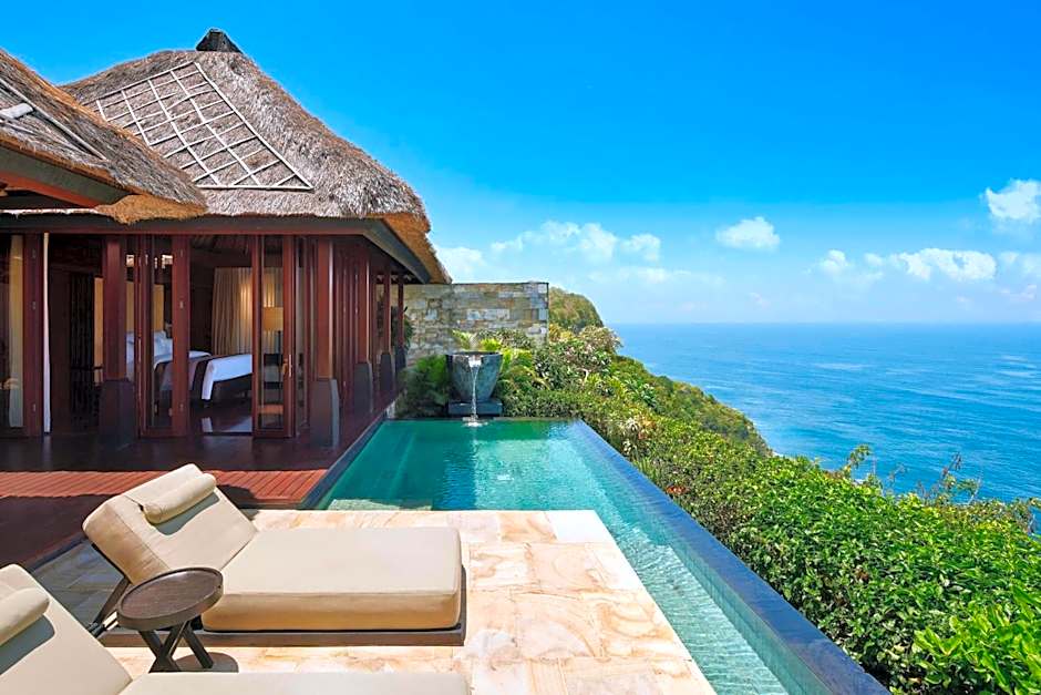 Located on the cliff edge with unobstructed views of the ocean, the villas features a plunge pool, a patio and an open-air living room with tropical garden. The bedroom is decorated with Indonesian art pieces and is fitted with an audiovisual equipment. The large bathroom features black terrazzo flooring, a bathtub, outdoor and indoor showers, and branded toiletries.