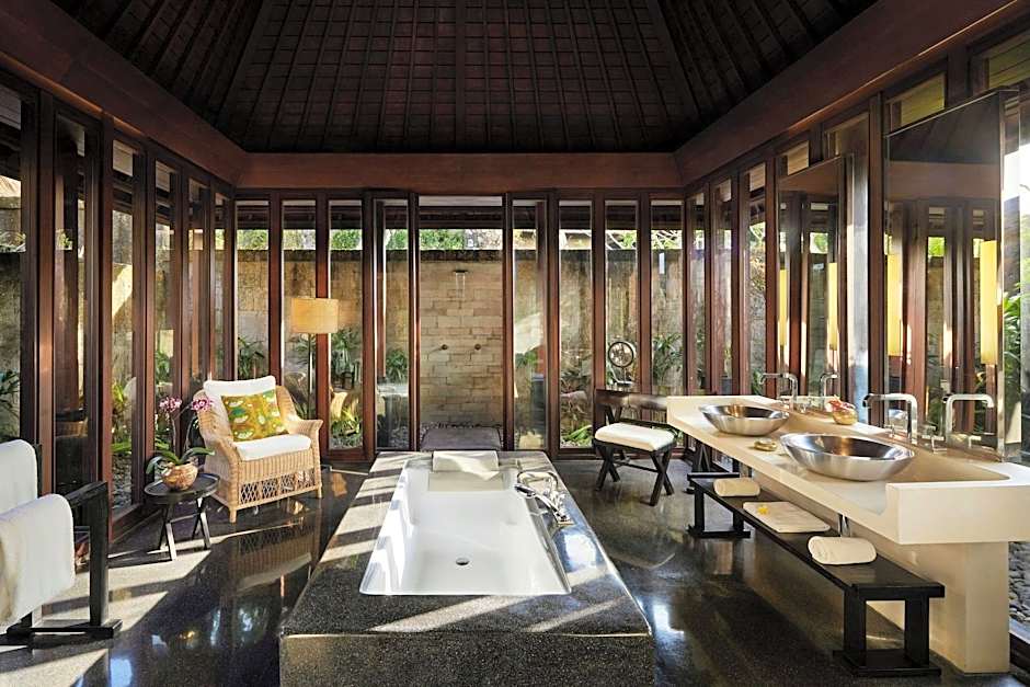 Located on a higher ground with a tropical garden and views of the ocean, the villa offers a plunge pool, a patio and an open-air living room. The bedroom is decorated with Indonesian art pieces and features an audiovisual equipment. The large private bathroom is fitted with terrazzo flooring, a bathtub, indoor and outdoor showers, and branded toiletries.