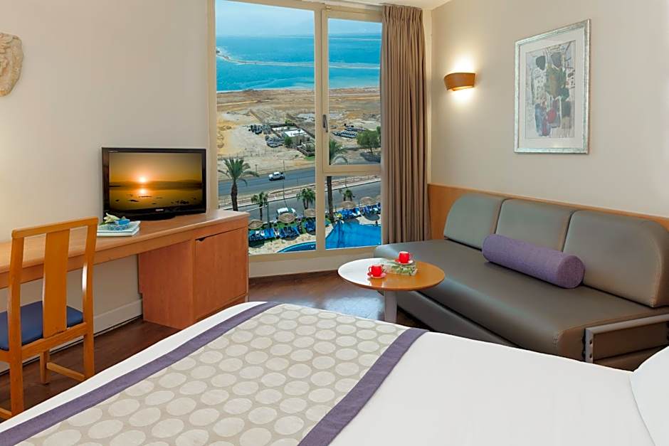 Large suite with seating area, 2 TVs and a balcony overlooking the Dead Sea.