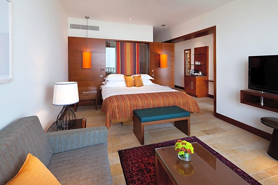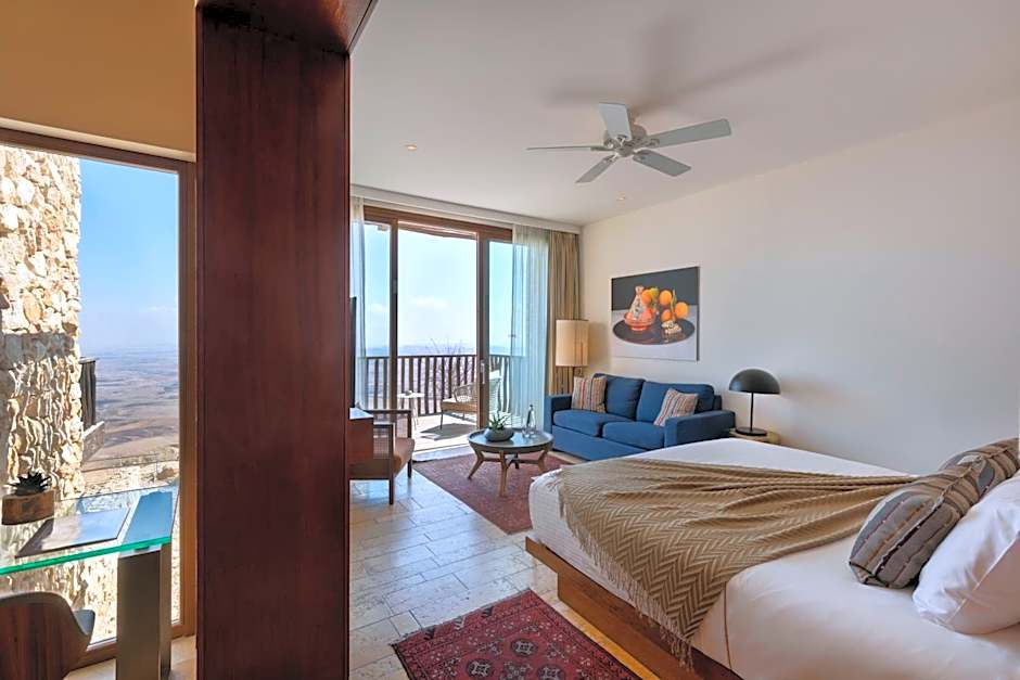 Luxurious room with a view of the Ramon Crater and a private balcony. Amenities include a mini-bar, a coffee set, a safe and a 42” LCD television on an adjustable stand. Bathroom comes with a bath and a shower, a magnifying mirror, a hairdryer and bathrobes.
