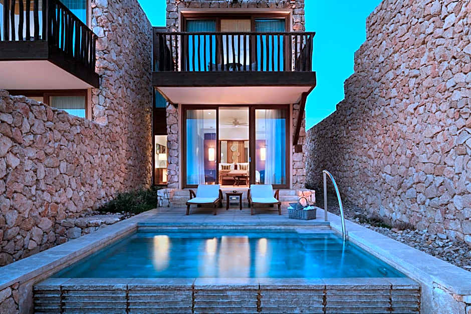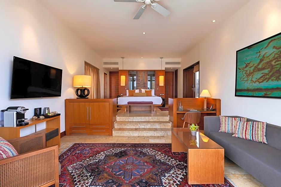 Luxurious villa with an adjacent pool, a private terrace, a bedroom and a living room. Amenities include a mini-bar, coffee set, Nespresso® machine and a 42” LCD television on an adjustable stand. Bathroom includes a bath and a shower, a magnifying mirror, a hairdryer and bathrobes.