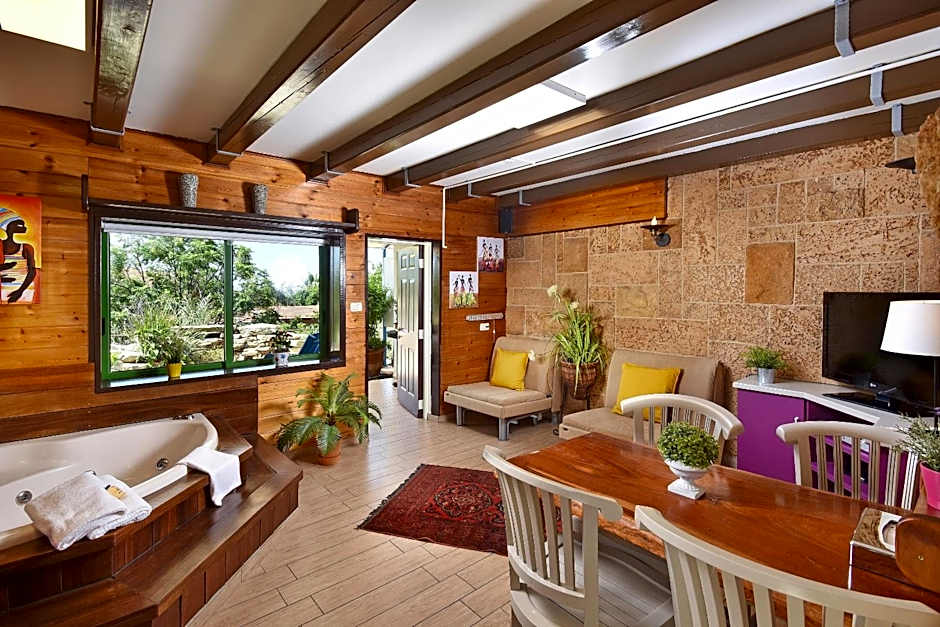 Large suit featuring a separate lounge with hot tub and a balcony overlooking the shared garden.