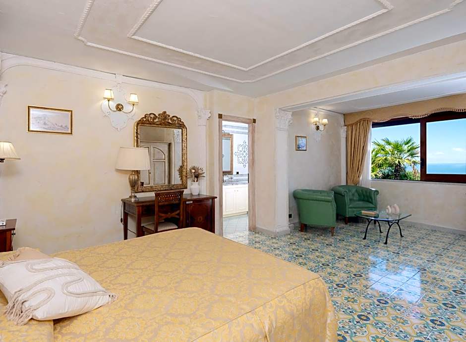 Large room with king size bed decorated in antique style, privacy glass and a lounge overlooking the sea. Bathroom features a shower and hand-painted tiles.