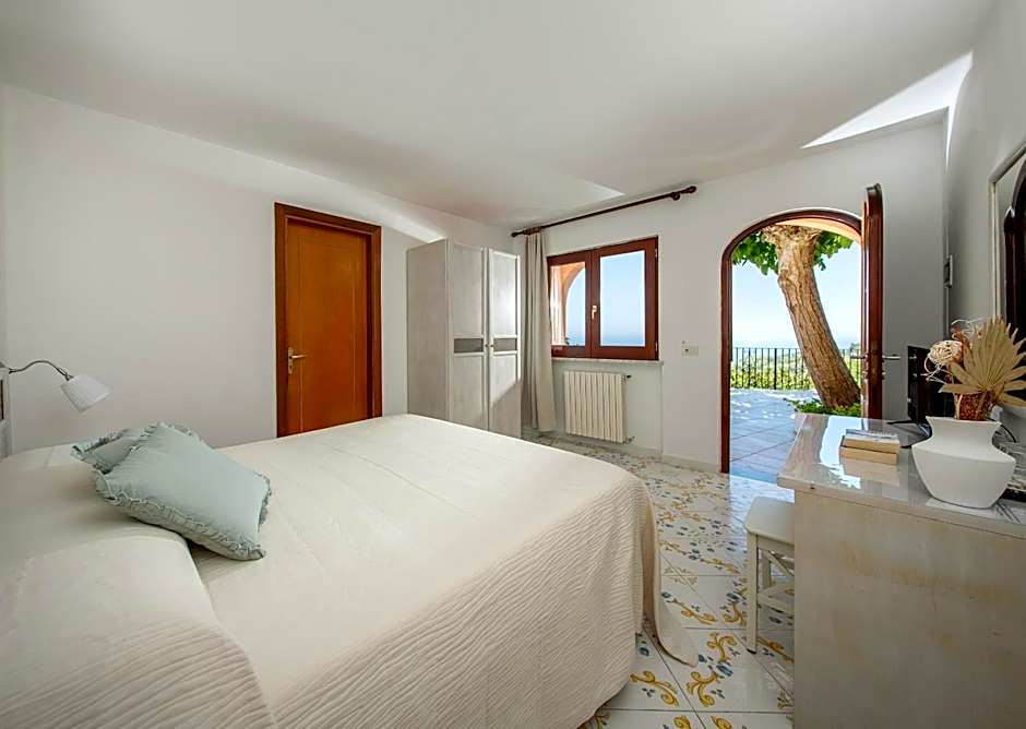 Room featuring a double bed and a single bed. Bright and airy, with direct access to the common terrace where you can admire the wonderful sea view.