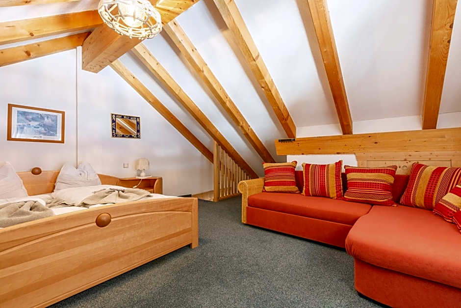 Spacious mountain-style room fitted with light-wood furnishings. Comes with LCD satellite TV and private bathroom. Features a living area with sofa, and a balcony or terrace with mountain views.