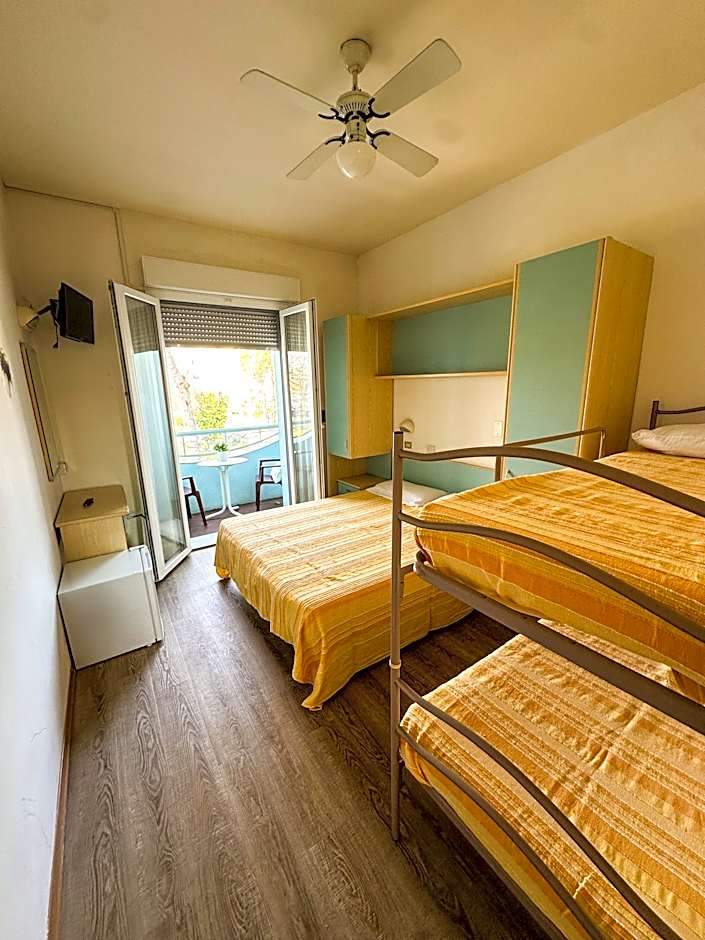 QUADRUPLA 4 PAX is 194 square feet and includes either a double bed 131-150 width or bunk beds plus balcony, cable tv, hairdryer, and safe.