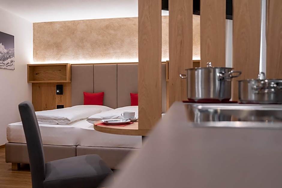 Accommodations include an Apartment, a Studio (and a Studio with Balcony), and a Standard Room. All are non-smoking and accommodate two adults and one child. Each space offers practical comforts, such as a balcony or terrace with mountain and landmark views, free toiletries, and free Wifi. Parking is convenient with free private parking and free parking on site.