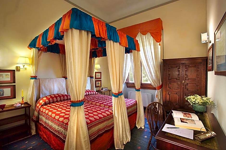 Spacious, elegant room with a decorative four-poster bed. The private bathroom features Carrara marble and hand-made tiles. Some rooms have a raised sleeping area.