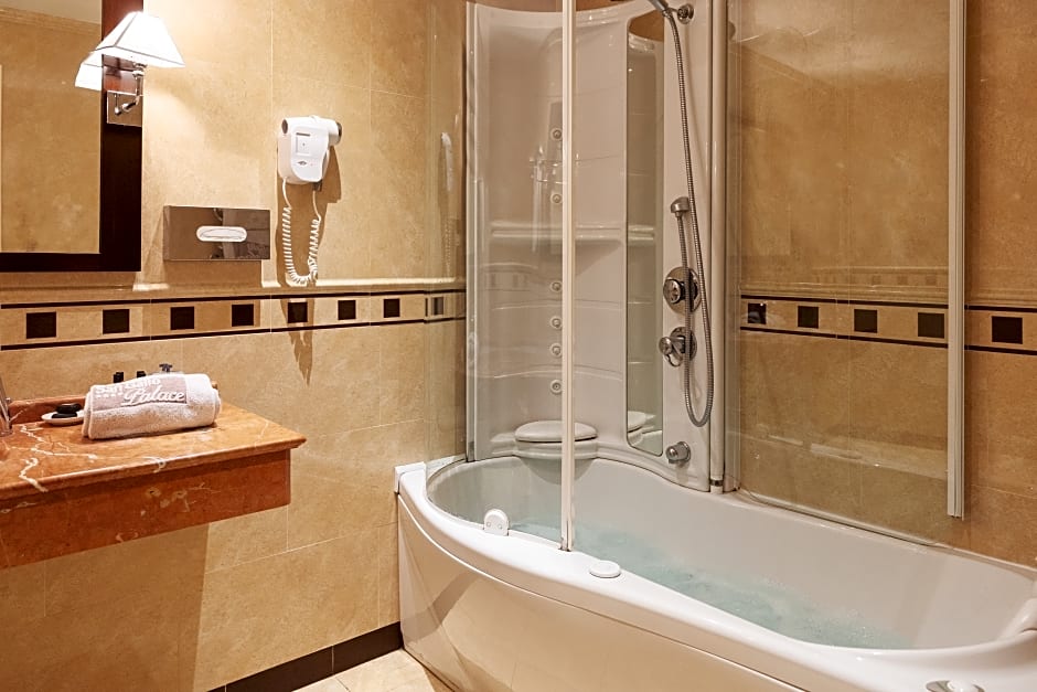 The San Gallo Palace Hotel offers a variety of rooms including Classic 1 Queen Bed rooms accommodating 2 adults and 1 child, Superior Triple Rooms with 4 Twin beds and 1 Queen bed accommodating 3 adults and 1 child, and suites like the Suite with Spa Bath accommodating 4 adults with a Queen size bed and a Sofa Bed. All rooms are nonsmoking.
