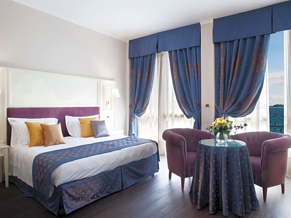 Large suite boasting a seating area, marble bathroom and a balcony overlooking Lake Garda. It includes a satellite TV, individually controlled air conditioning, and soft bathrobes plus slippers.