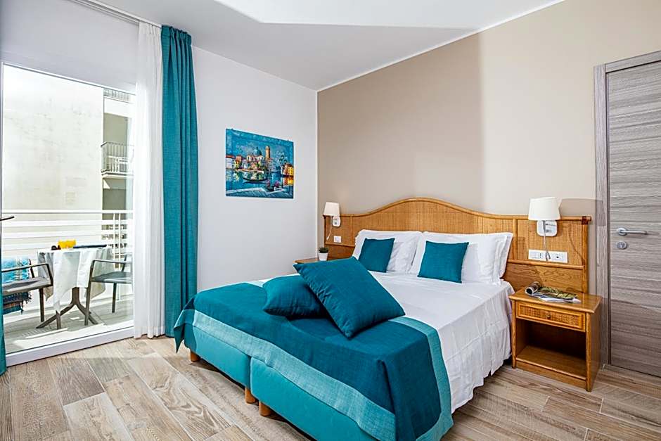 Two air-conditioned connected rooms with 2 bathrooms, free WiFi and 2 balconies with partial sea view.