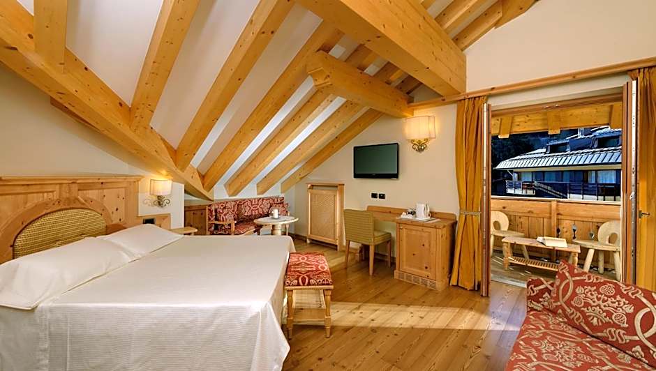 Some suites boast an electric fireplace and a balcony with views of the slopes of the 3- Tre race of the Alpine Skiing World Cup.