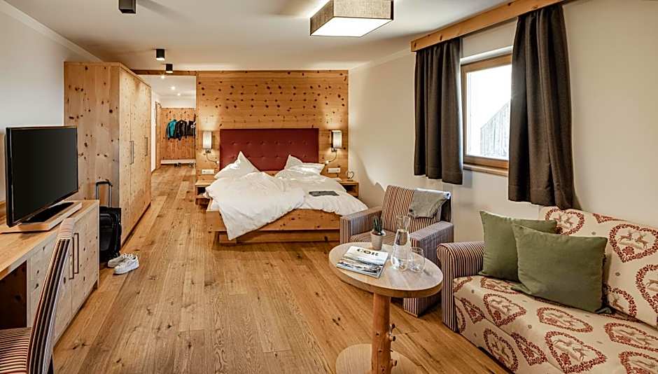 Room choices cater to different tastes and group sizes, from the Deluxe Double Room (269 square feet) with a king bed to larger options like Suite Huberhof (549 square feet) featuring a sofa bed, queen bed, and bunk bed. Other configurations include the Deluxe, King (270 square feet), Superior Double Room (355 square feet) with a sofa bed and queen bed, and family-friendly suites such as Suite Dolomitenblick (463 square feet) with a sofa bed and queen bed. A range of additional rooms—Double Rooms, Junior Suites, and Family Suites in various sizes and views—offers flexibility for two adults and up to one child in many cases.