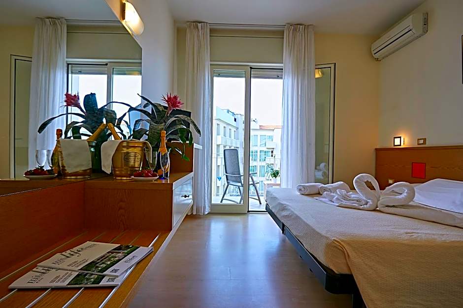 Room with attached bathroom with parquet floors. Features a satellite TV with satellite channels and air conditioning. The balcony offers views of the Adriatic Sea.