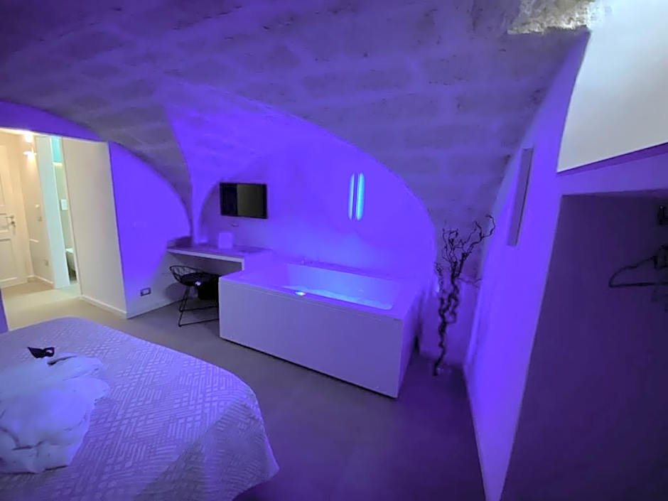 Latest creation, luxurious room with freestanding Jacuzzi tub in the center of the room made from the existing authentic rock it is positioned on the -1 floor with a small window. Furnished in contrast with the typology of the tuff vaults in a modern and refined style. Guests will find a welcome prosecco to notice them. Also salts and fragrances on request based on availability. Concludes a rich assortment of drinks and snacks.