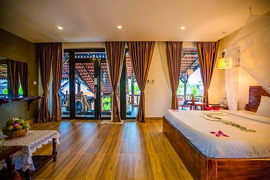 Room choices cater to different needs: the Deluxe and Quadruple are smoke-free options that sleep two adults. The Standard Family measures 344 square feet, is non-smoking, and accommodates up to four adults and three children with two queen beds. The Double Room is 183 square feet, non-smoking, and accommodates two adults and one child with a queen bed.