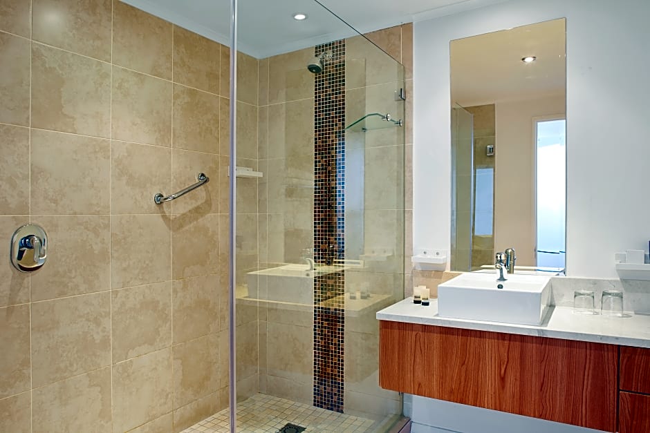 This junior suite features a flat-screen TV. The bathroom has a shower and a hairdryer.