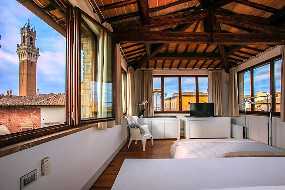 It features a sauna and overlooks the Torre del Mangia tower.