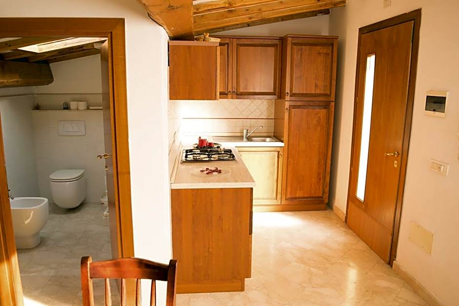 This studio is located in the attic, and has sloped ceilings. The room access has spiral staircases that are not suitable for pets.