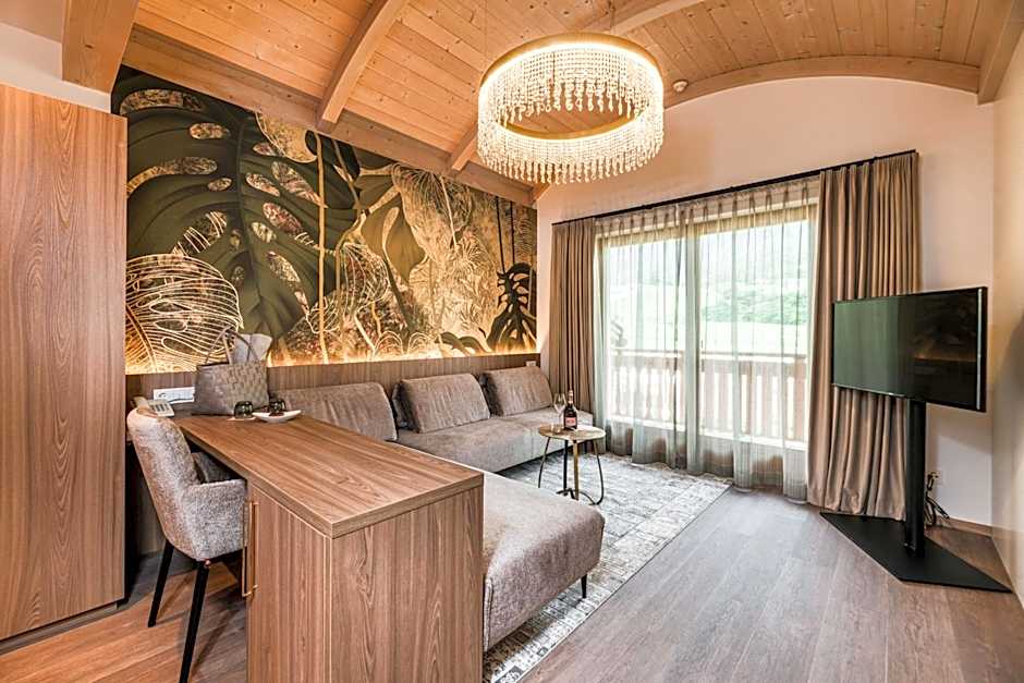 This spacious junior suite offers a living area, a balcony, and large windows with views of the garden and the surrounding Dolomite mountains.