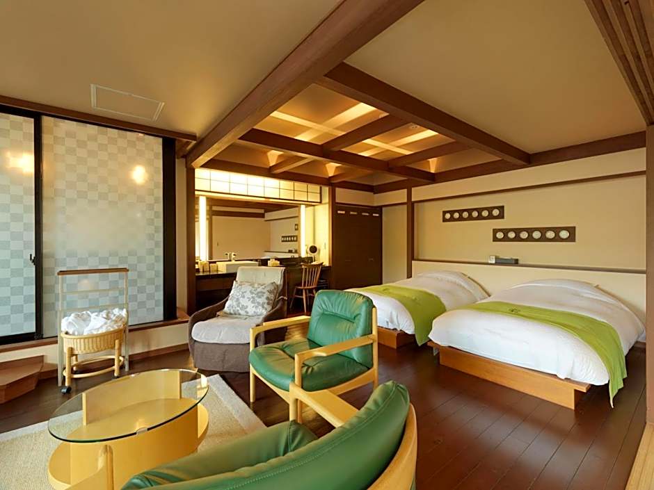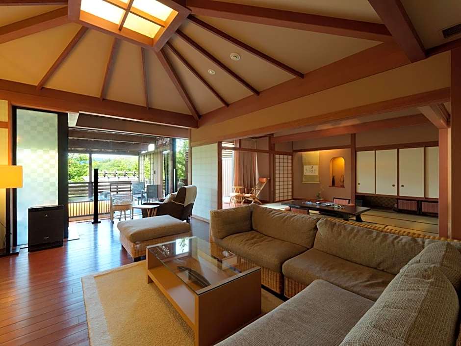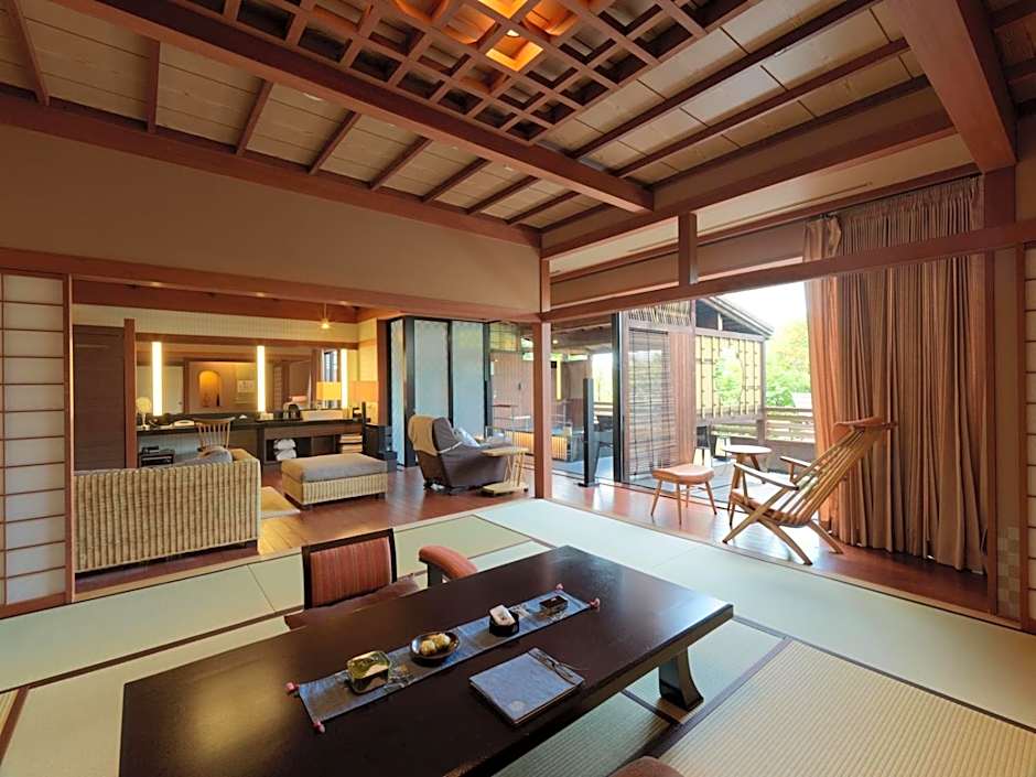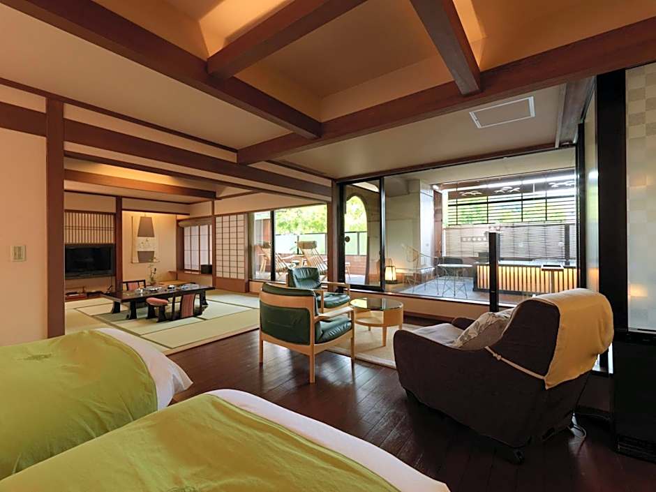 Featuring a forest view and a spacious private open-air bath, this large suite comes with traditional futon bedding on a tatami (woven-straw) floor. It has a balcony, CD player and DVD player. Includes a Japanese breakfast and a traditional kaiseki multi-course dinner.