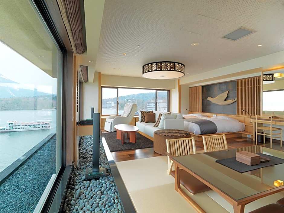 Guests will have a special experience as the quadruple room features a private open-air bath. Providing free toiletries, this quadruple room includes a private bathroom with a bath, a shower and a hairdryer. The spacious air-conditioned quadruple room provides a flat-screen TV, tatami, a tea and coffee maker, executive lounge access as well as lake views. The unit offers 2 beds and 2 futons.