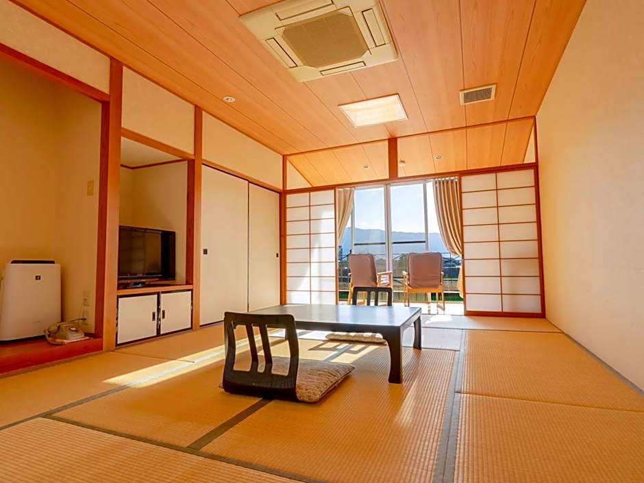 The quadruple room offers air conditioning, tatami, a terrace with mountain views as well as a shared bathroom boasting a bidet. The unit has 4 futons.