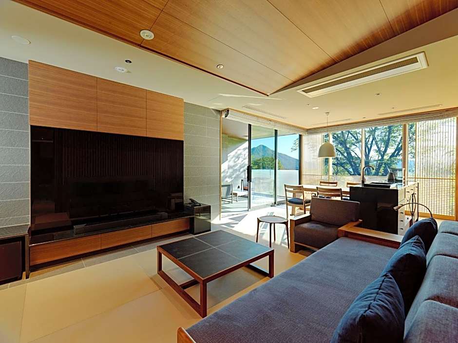 Guests will have a special experience as this triple room provides a hot tub and a private open-air bath. Offering free toiletries and bathrobes, this triple room includes a private bathroom with a bath, a shower and a bidet. The spacious air-conditioned triple room offers a flat-screen TV with streaming services, tatami, a tea and coffee maker, a wardrobe as well as lake views. The unit offers 2 beds and 1 futon.
