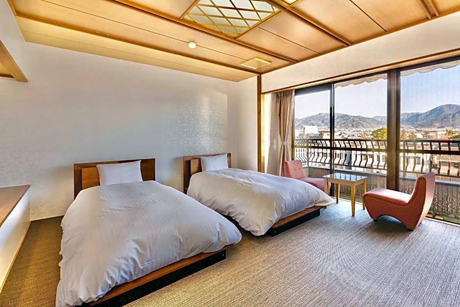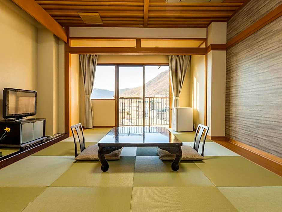 This twin room's special feature is the hot tub. The twin room provides air conditioning, tatami, a balcony with mountain views as well as a shared bathroom featuring a bath. The unit offers 2 futons.