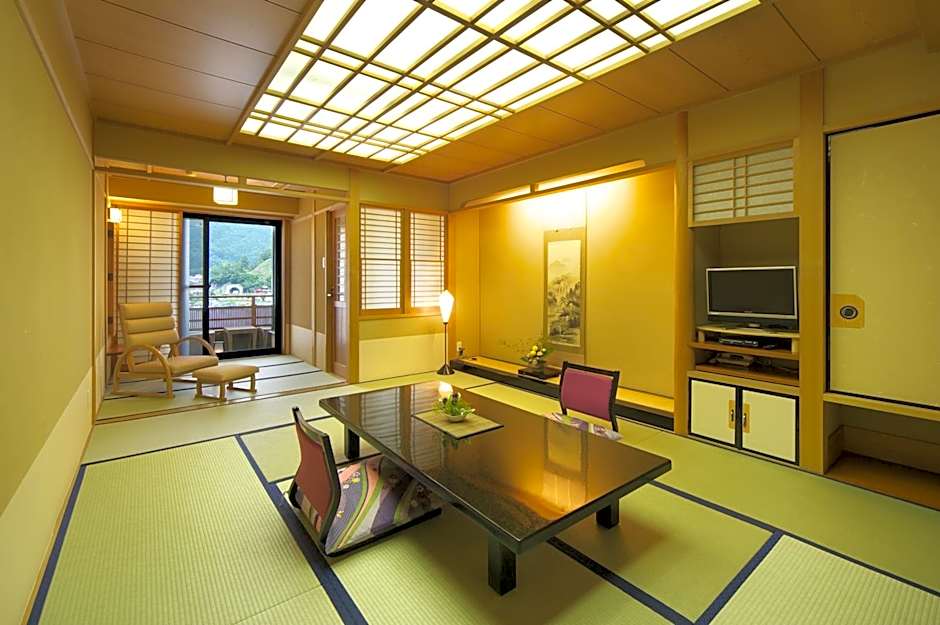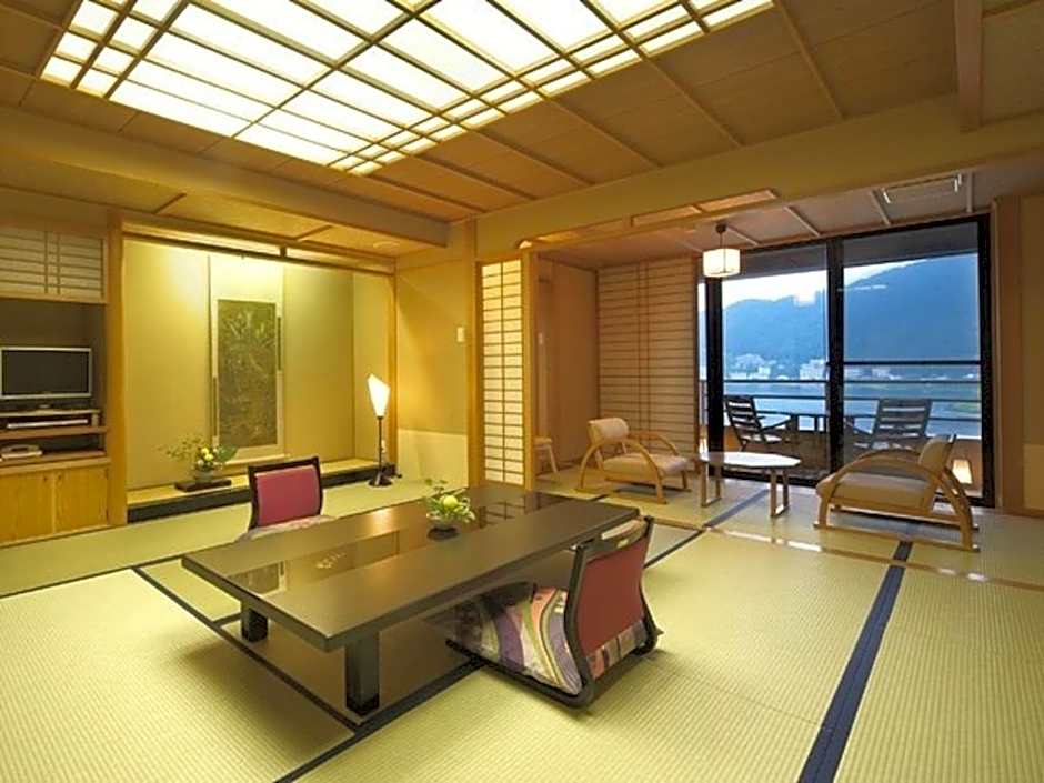 Spacious room featuring a private open-air bath with stunning lake views, a tatami (woven-straw) floor and traditional futon bedding. Guests are waited on by a personal attendant. Amenities include an LCD TV with satellite channels, a mini-fridge and a safe.