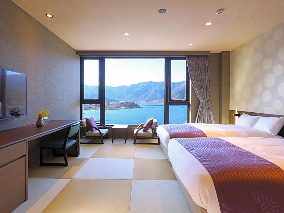 Featuring Western beds and a tatami (woven-straw) area, this room is fitted with chic furnishings and large windows, which offer plenty of sunlight and great lake views. A flat-screen TV and a fridge are provided in the room. The private bathroom includes free toiletries.
