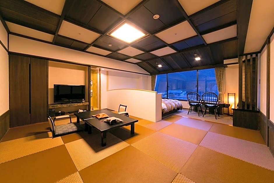 Guests will have a special experience as this suite provides a private open-air bath. This spacious suite consists of 1 living room, 2 separate bedrooms and 1 bathroom with a bath and free toiletries. The suite features tatami floors, a seating area with a flat-screen TV with satellite channels, air conditioning, a wardrobe, as well as a safe deposit box. The unit offers 2 beds and 3 futons.