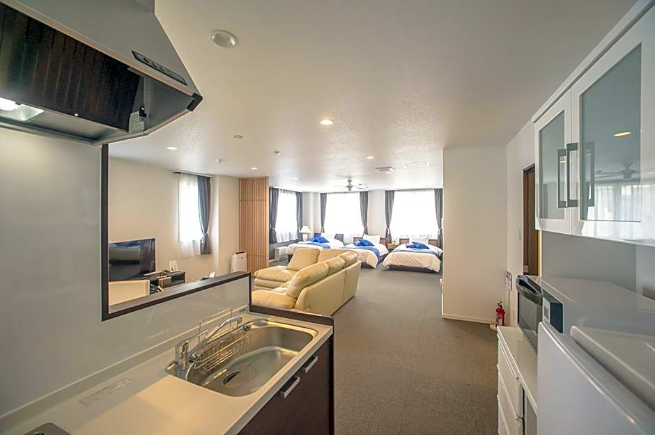 This apartment has a fully equipped kitchen, satellite flat-screen TV and massage chair. Features 2 small double beds (47 in wide). 1 double bed and 4 Japanese futon bedding are provided.