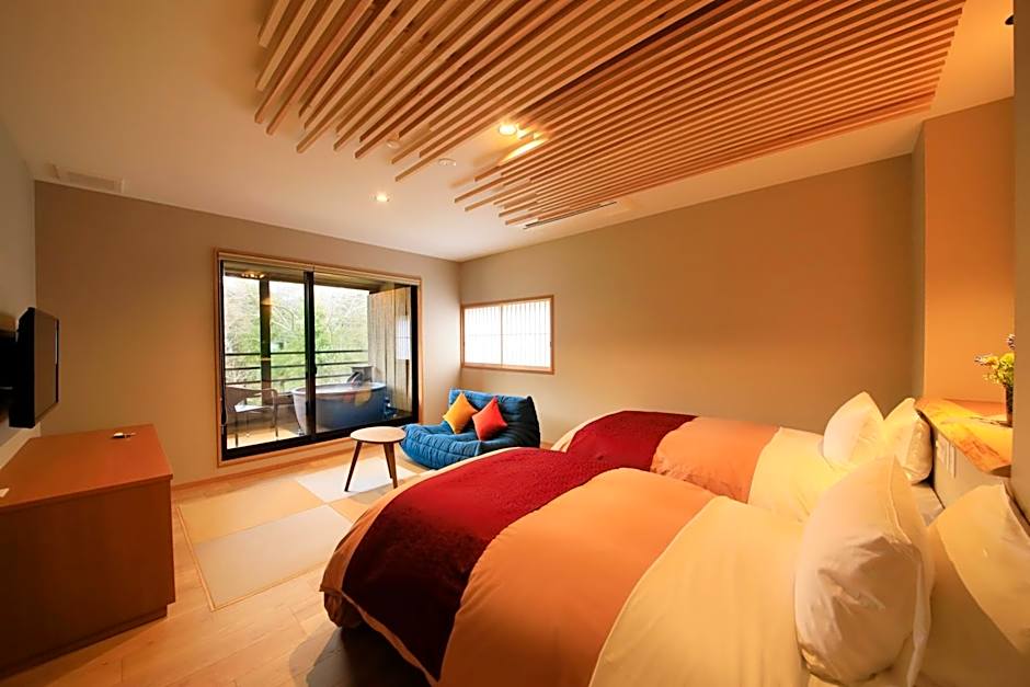 The hot tub and private open-air bath are the special features of this twin room. The spacious twin room offers air conditioning, a wardrobe, a terrace with garden views as well as a private bathroom boasting a bath. The unit has 2 beds and 2 futons.