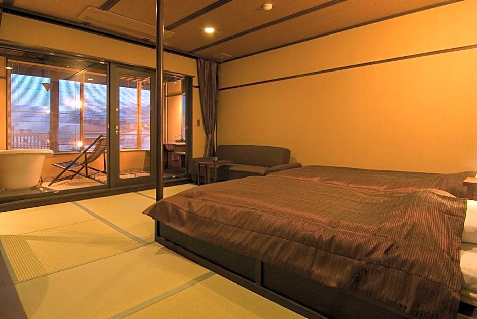 Tranquil room featuring a tatami (woven-straw) floor, on which traditional futon bedding is spread to sleep in. Amenities include an LCD TV, a safe and yukata robes. The room has a private toilet and washstand, while bathroom facilities are shared.