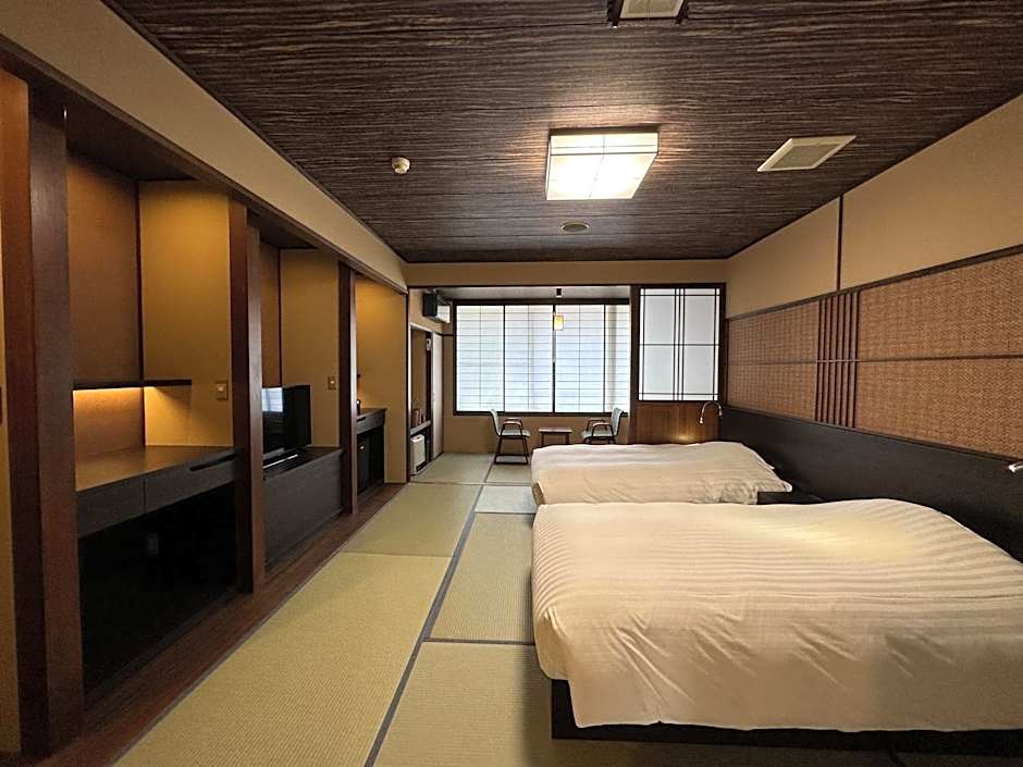 Featuring free toiletries, this twin room includes a shared bathroom with a bidet, a hairdryer and slippers. This twin room is air-conditioned and has a seating area with a flat-screen TV, tatami, a tea and coffee maker, a wardrobe, as well as a safe deposit box. The unit has 2 beds.